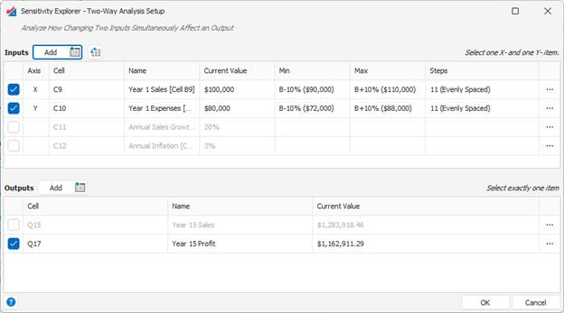 Start by selecting exactly two inputs and a single output from your workbook model.  If you have previously used this workbook with Sensitivity Explorer, your input and output may already be shown in the lists.  If they are not yet there, click the input or output “Add” button to add the cells.  (See the article Working with Inputs and Outputs for more information.)