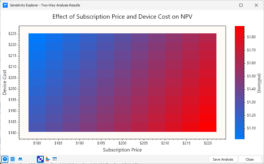 After the analysis is complete, a result window is displayed.  Two-way analysis results include two result views: Heat Map View, and Table View.    These are simply two ways of presenting the same underlying set of results.   The initial view displayed will depend on the menu item you chose from the ribbon when starting the analysis, but you can change the view by clicking the view buttons at the bottom of the window.