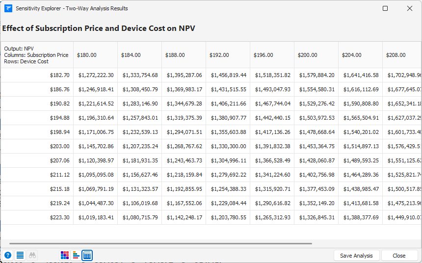 When you click the OK button, Sensitivity Explorer varies the two inputs over all possible combinations of the values you specified for them.  For each pair of values, Excel recalculates your spreadsheet and records the output value.