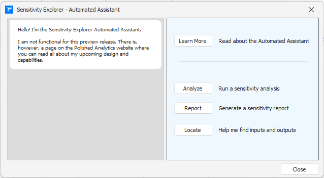 Please note: The Automatic Assistant feature is still under development. In the Preview release of Sensitivity Explorer, the Automatic Assistant is not functional.